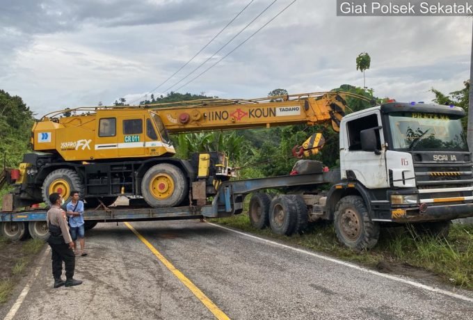 Nyaris Celaka, Tronton Muatan Crane Melintang di Badan Jalan