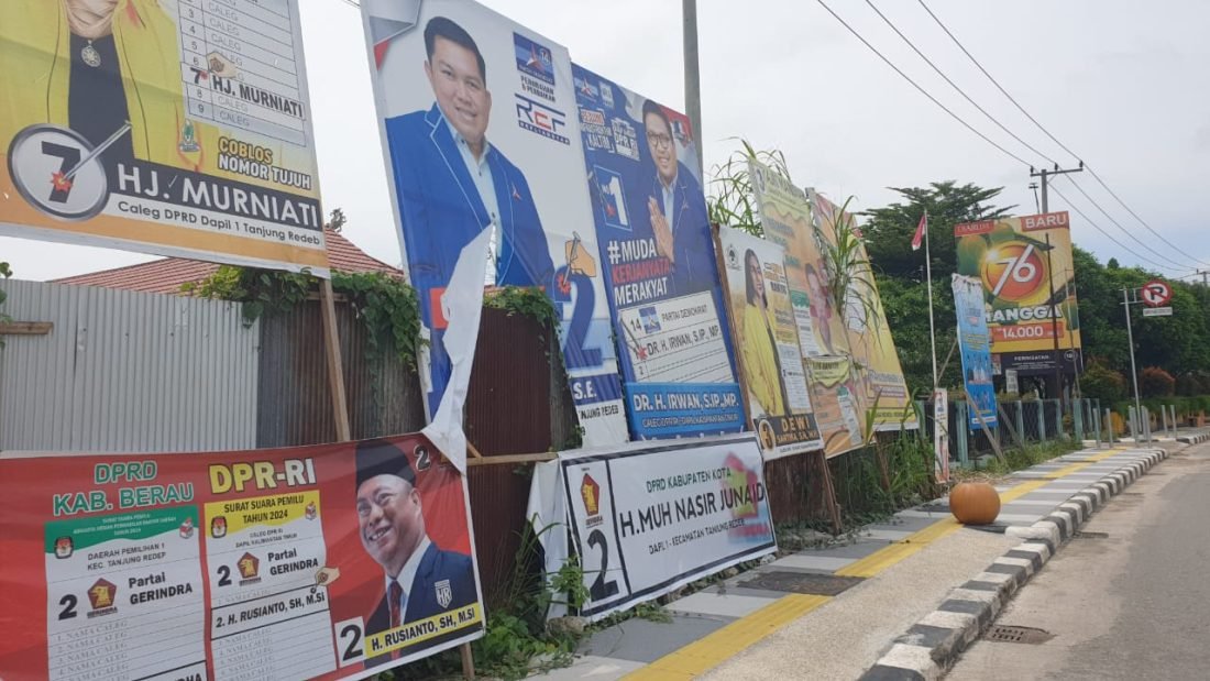benuanta.co.id, BERAU – Selama masa kampanye, tak sedikit masyarakat mengeluhkan kondisi jalan yang semakin semrawut dengan kehadiran Alat Peraga Kampanye (APK) seperti baliho Calon Legislatif (Caleg) hingga bendera partai politik yang memenuhi jalanan. Bahkan, beberapa lokasi pemasangan baliho caleg dengan ukuran cukup besar terlihat rusak atau nyaris rebah dan dikhawatirkan akan mencelakai masyarakat yang melintas.