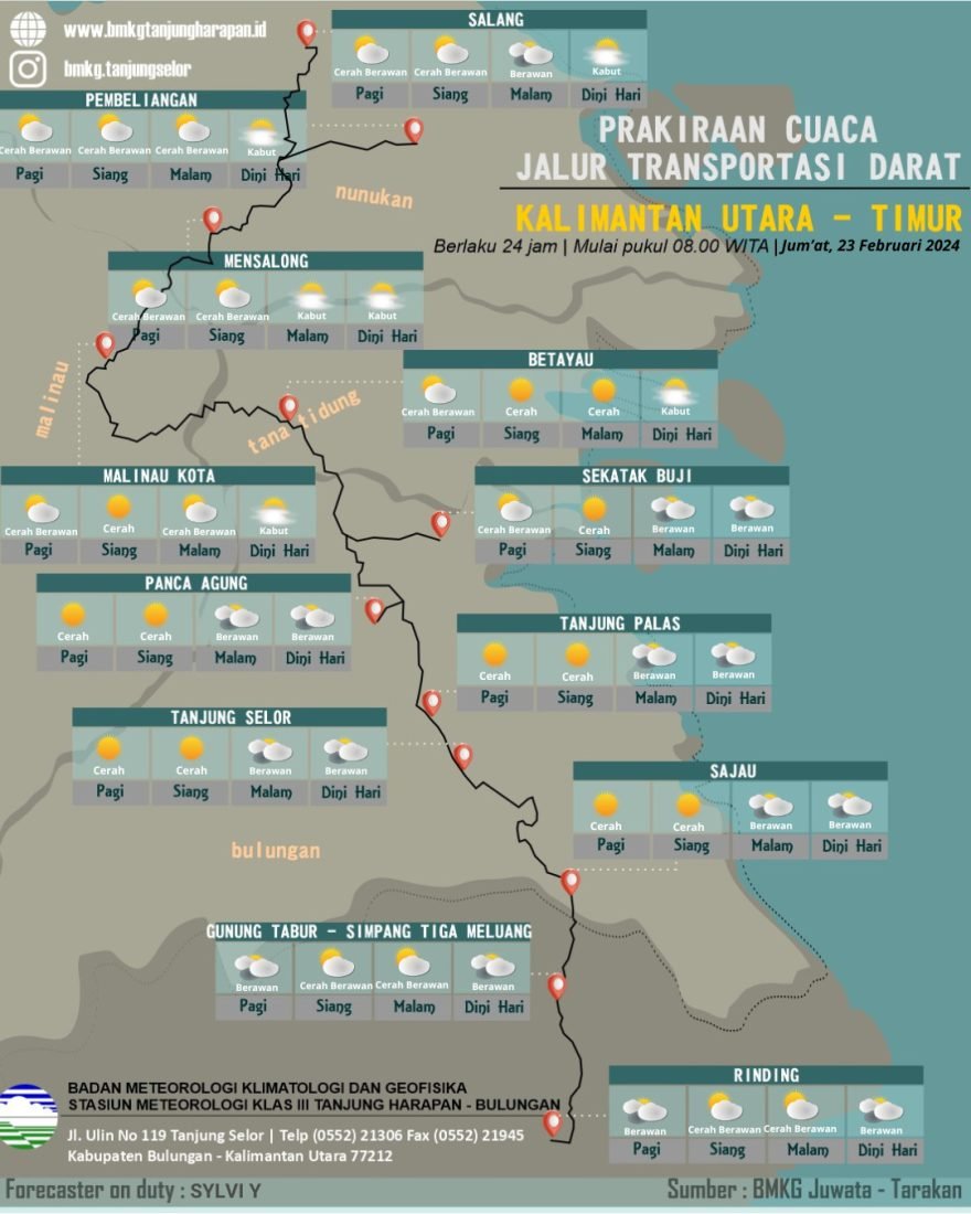 benuanta.co.id, TANJUNG SELOR – Cuaca di jalur transportasi darat yang menghubungkan Tanjung Selor dengan wilayah lain di Kabupaten Bulungan, Provinsi Kalimantan Utara (Kaltara) diperkirakan cerah berawan sepanjang hari pada Jumat, 23 Februari 2024.
