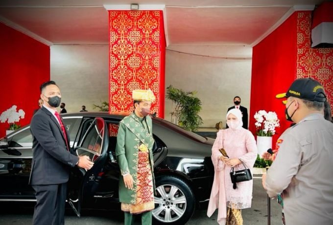 Jakarta – Presiden Joko Widodo mengenakan baju adat Bangka Belitung warna hijau
