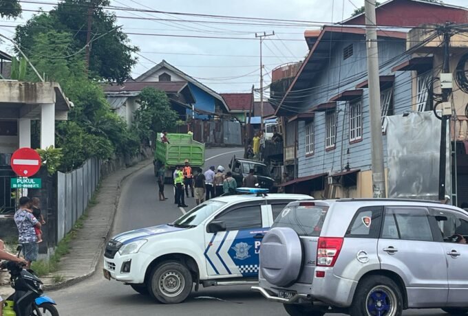 Pikap Pengangkut Kayu Tergelincir di Jalan Tengku Umar