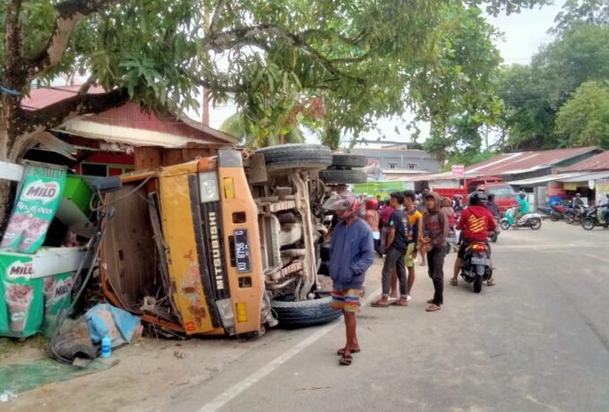 Truk Bermuatan Pasir Hantam Warung dan Kendaraan Milik Warga di Jalan Aki Balak