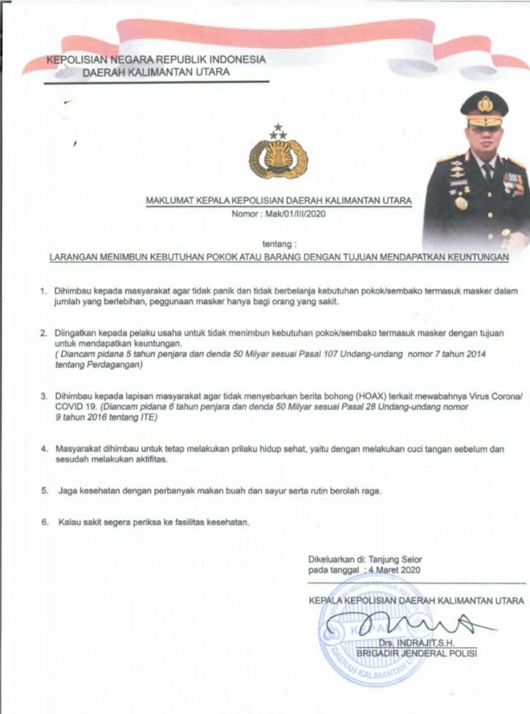 Menghindari info tidak benar atau hoaks terkait virus Corona ini, Kapolda Kaltara pun mengeluarkan maklumat dengan Nomor : Mak/01/III/2020 tentang Larangan Menimbun Kebutuhan Pokok atau Barang dengan Tujuan Mendapatkan Keuntungan.
