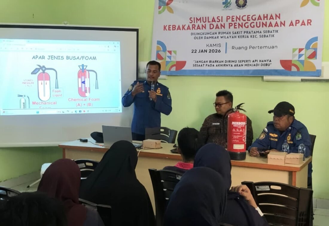 benuanta.co.id, NUNUKAN – Dinas Pemadam Kebakaran dan Penyelamatan Sektor Sebatik melakukan simulasi kebakaran dan sosialisasi penggunaan alat pemadam api ringan (apar) di Rumah Sakit Pratama Jalan Padaelo RT 08 Desa Tanjung Karang Kecamatan Sebatik.