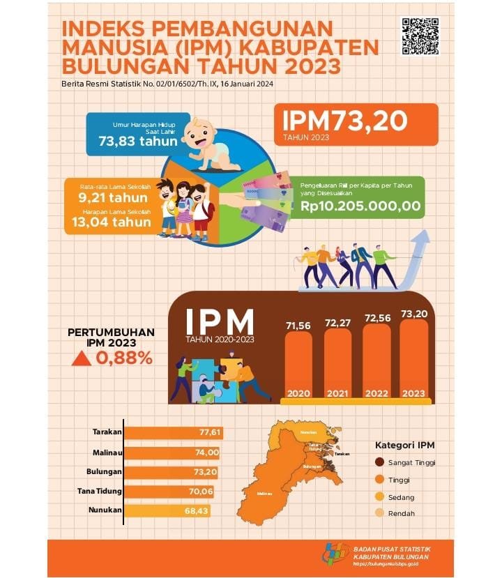 Selama 2020-2023, Indeks Pembangunan Manusia (IPM) Kabupaten Bulungan rata-rata meningkat sebesar 0,76 persen per tahun, dari 71,56 pada tahun 2020 menjadi 73,20 pada tahun 2023.