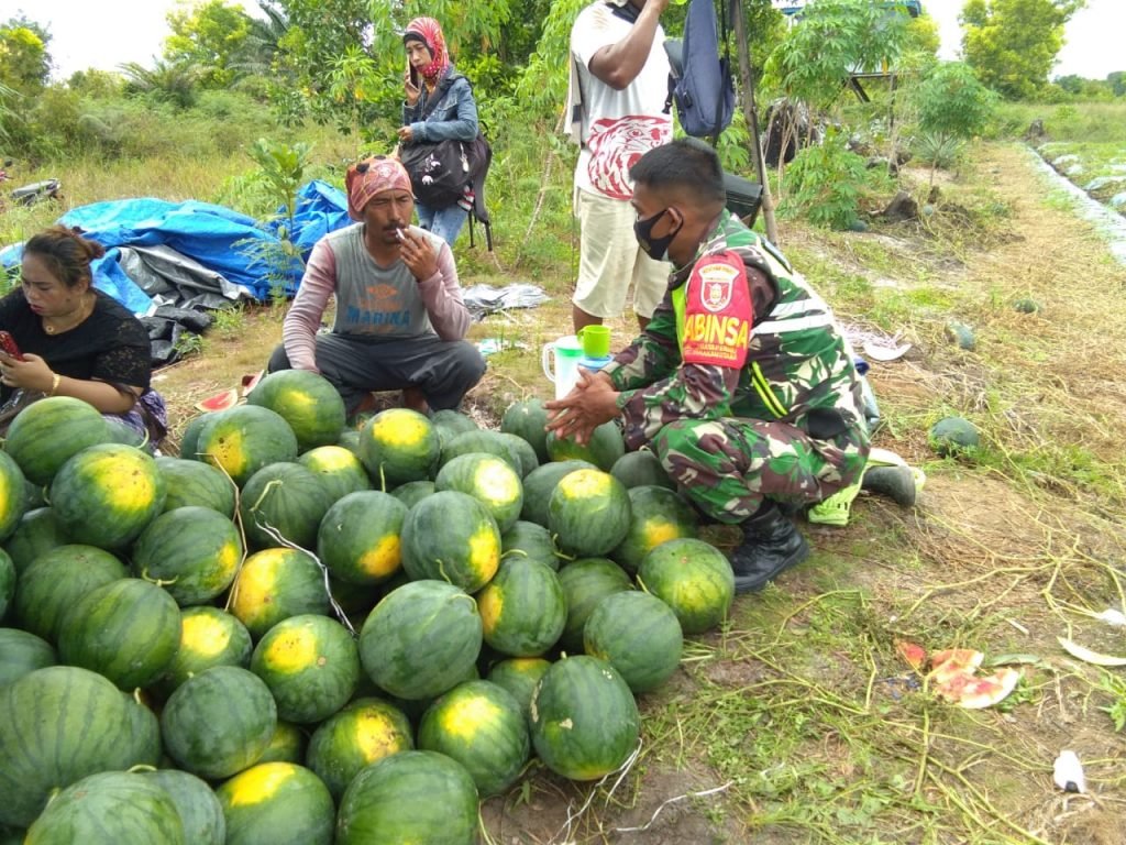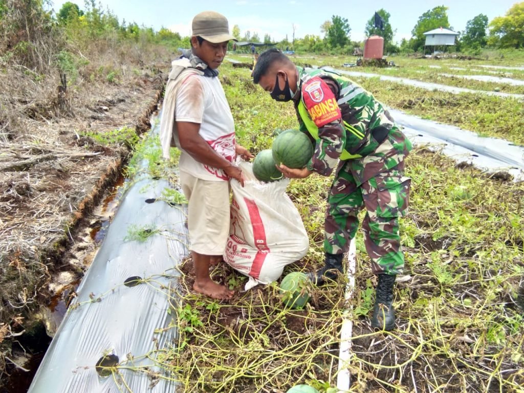 TARAKAN – Guna mendukung Progam hanpangan selama pandemi Covid-19, Babinsa jajaran Kodim 0907/Trk terus aktif memberikan pendampingan pertanian di wilayah desa binaan masing-masing. Seperti Babinsa Koramil 0907/04 Tarakan Utara (Tarut), Koptu Simanjuntak yang ikut membantu memanen semangka di lahan milik Samporno yang ada di RT. 20, Kelurahan Juata Permai, Kecamatan Tarakan Utara, Selasa (3/11/2020).