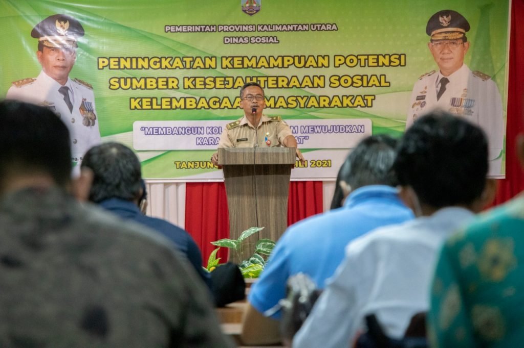 TANJUNG SELOR – Pemerintah Provinsi Kalimantan Utara (Kaltara) menggelar kegiatan peningkatan kemampuan potensi sumber kesejahteraan sosial kelembagaan masyarakat dan dirangkai dengan kegiatan sinkronisasi pengembangan program dunia usaha di Ballroom Hotel Pangeran Khar, Selasa (4/5/2021).
