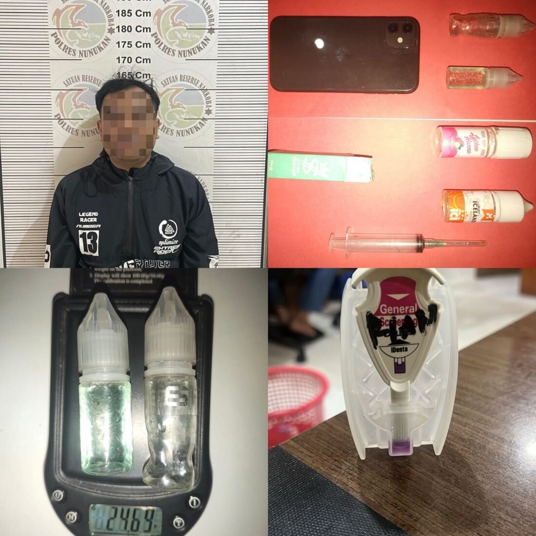 benuanta.co.id, NUNUKAN– Satuan Reserse Narkoba (Satreskoba) Polres Nunukan mengamankan seorang pria berinisial H (27) warga Jalan Kampung Rambutan RT 002 Kelurahan Nunukan Timur, Kecamatan Nunukan yang diduga merupakan pengedar liquid atau cairan mengandung narkoba jenis ganja sintetis.