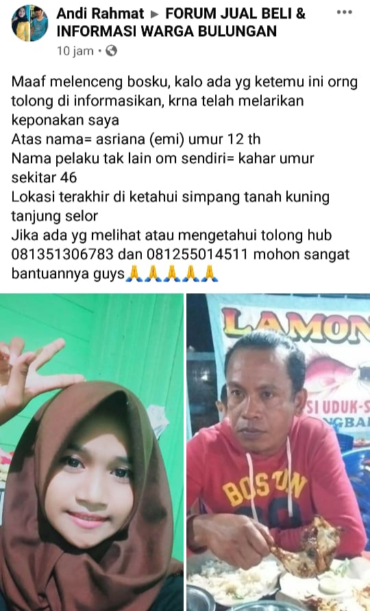 TANJUNG SELOR – Jagat maya kembali ramai khususnya grup facebook. Dalam postingan facebook itu, seorang pria bernama Kahar telah membawa kabur anak di bawah umur yang tak lain keponakannya sendiri bernama Asriani atau Emi (12).