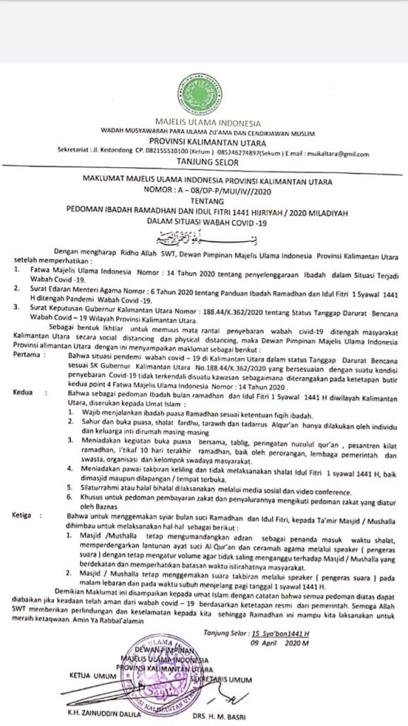 TARAKAN – Majelis Ulama Indonesia (MUI) Provinsi Kalimantan Utara sudah menerbitkan maklumat tentang pedoman ibadah Ramadan 1441 H.