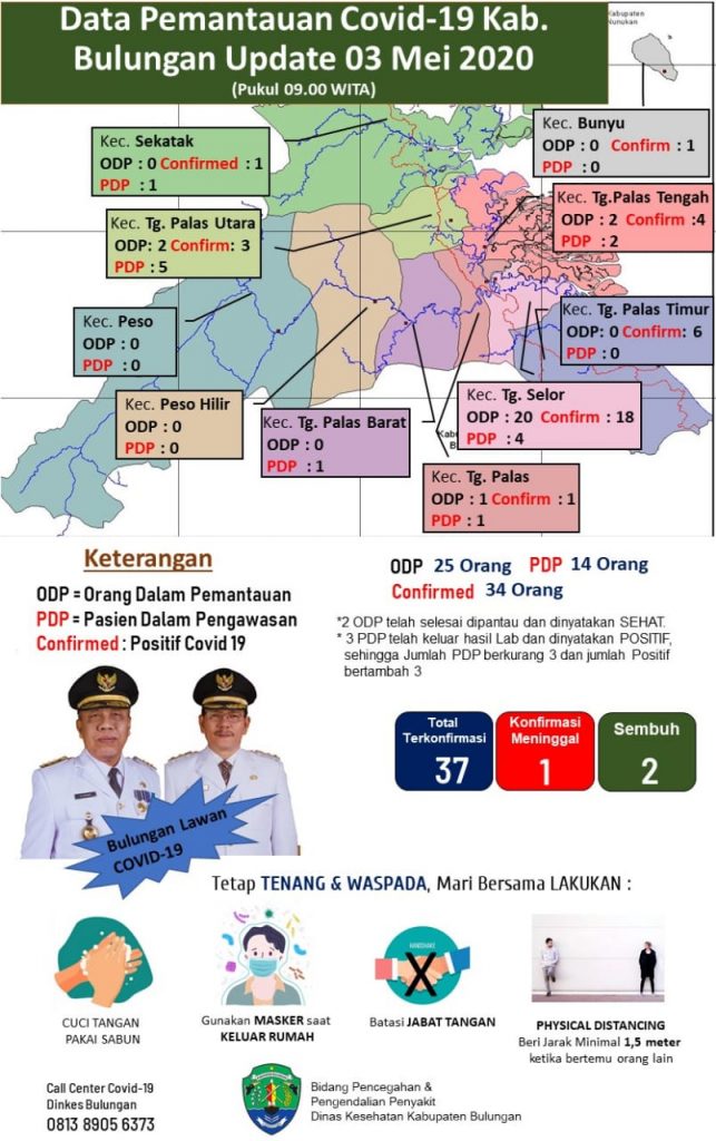 “2 PDP dari Kecamatan Tanjung Palas Timur dan 1 PDP dari Bunyu, setelah keluar hasil dari laboratorium hasilnya positif,” ungkap Jubir Covid-19 Bulungan dr Heriyadi Suranta dalam rilisnya, Ahad 3 Mei 2020.