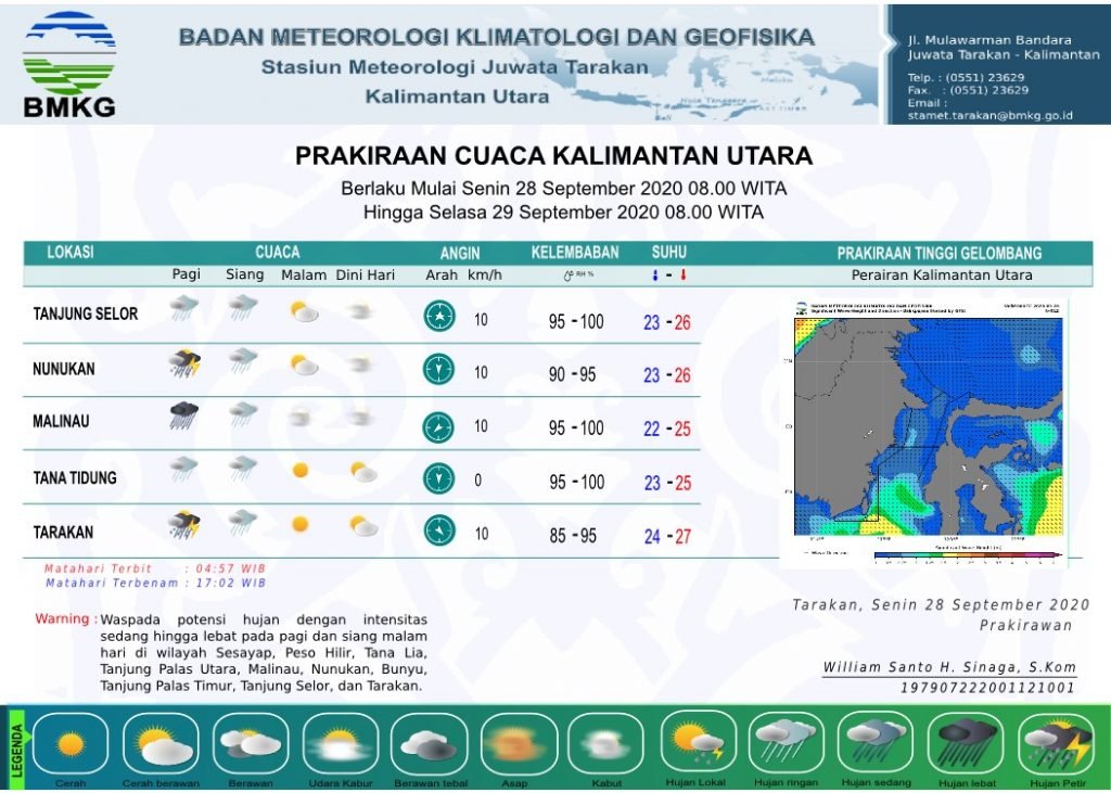 Berdasarkan prakiraan cuaca yang dirilis secara resmi oleh BMKG Tarakan di websiten https://www.bmkg.go.id/, untuk cuaca di Provinsi Kalimantan Utara pada Senin 28 September 2020 pukul 10.00 WITA masih berpotensi terjadi hujan sedang-lebat yang dapat disertai angin kencang.