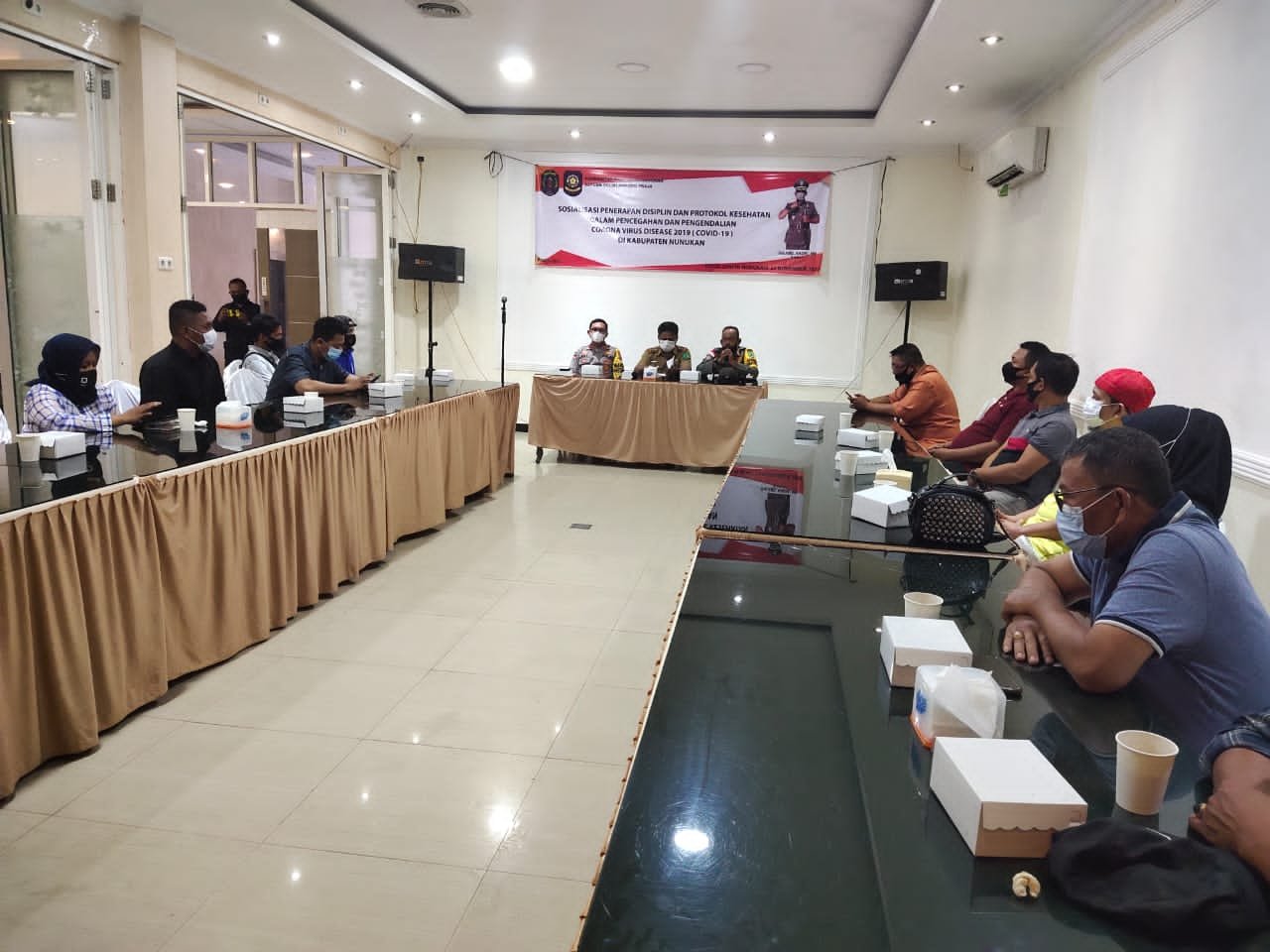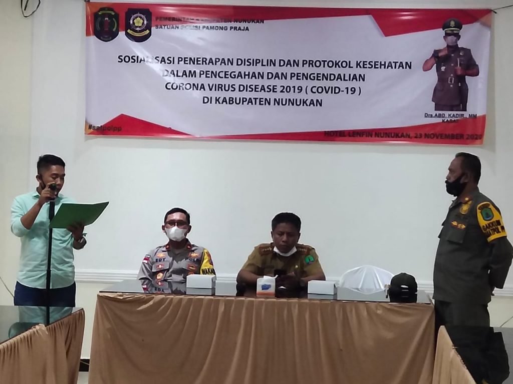 NUNUKAN – Pemerintah Kabupaten Nunukan melalui Satuan Polisi Pamong Praja (Satpol PP) mengadakan sosialisasi peningkatan status Peraturan Bupati menjadi Peraturan Daerah Penerapan Disiplin Protokol Kesehatan (Prokes) Dalam Pencegahan dan Pengendalian Covid-19 di Kabupaten Nunukan, kepada masyarakat baik itu pelaku usaha seperti tempat hiburan dan pemilik kafe, Senin (23/11/2020) di Hotel Lenfin.