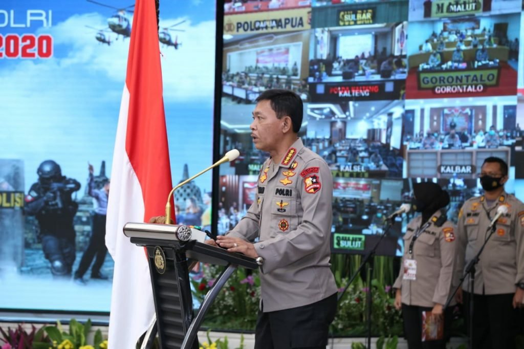 JAKARTA – Kapolri Jenderal Idham Azis memimpin apel Kepala Satuan Wilayah (Kasatwil) seluruh Indonesia di Gedung Rupatama Mabes Polri, Jakarta Selatan, Rabu (25/11/2020). Kegiatan ini diikuti oleh 34 Kapolda dan 493 Kapolres.