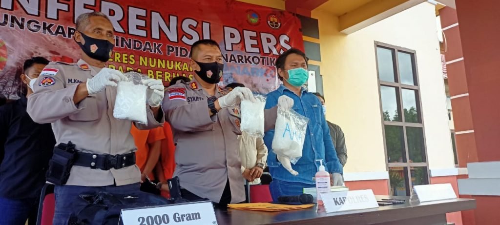 NUNUKAN – Polres Nunukan menggelar Konferensi pers, pengungkapan tindak pidana narkotika sebanyak 2.000 Gram atau 2 kilogram (kg) sabu penyeludupan dari Tawau Malaysia.