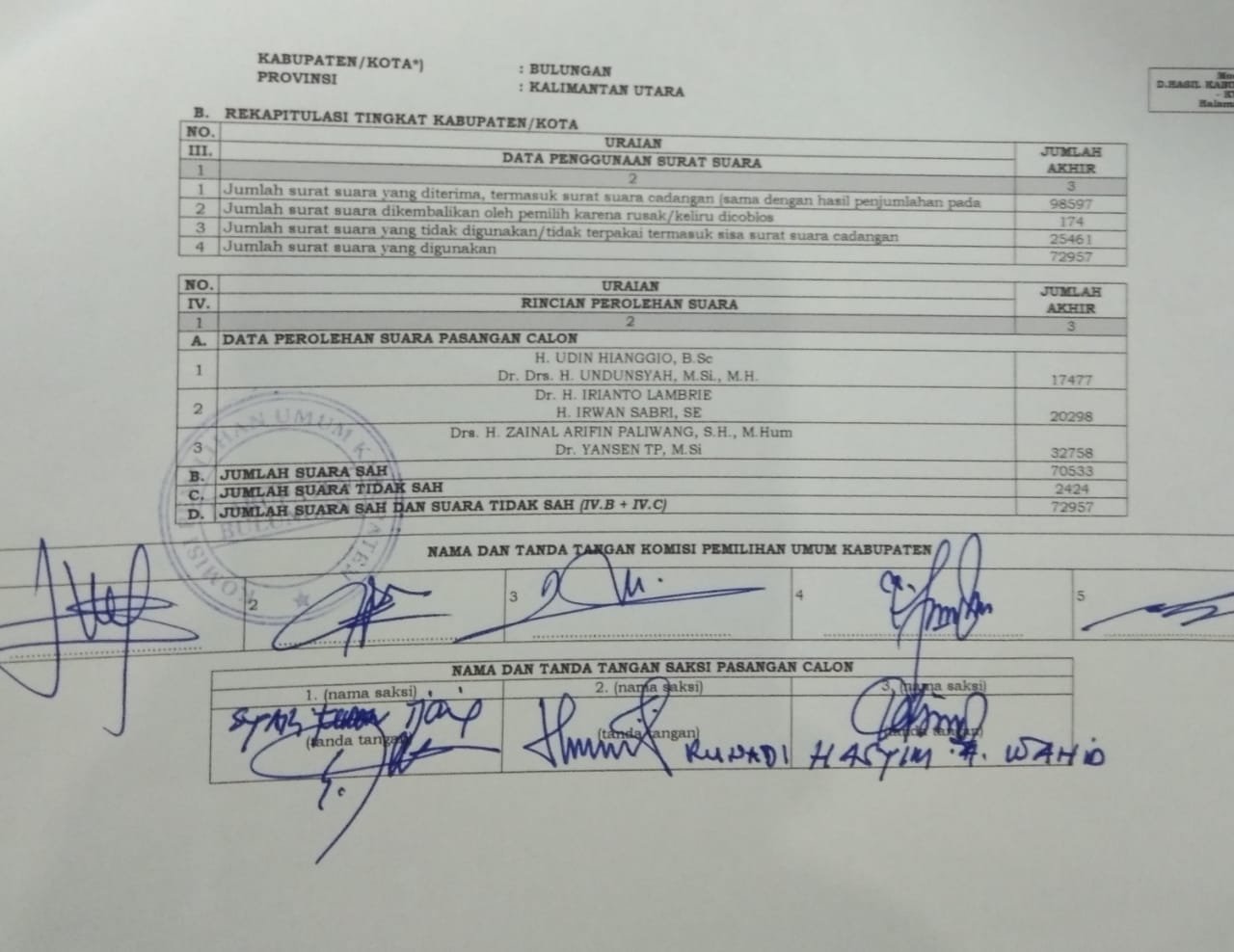 Berikut hasil Rekapitulasi perhitungan suara Pilgub Kaltara di Kabupaten Bulungan :
