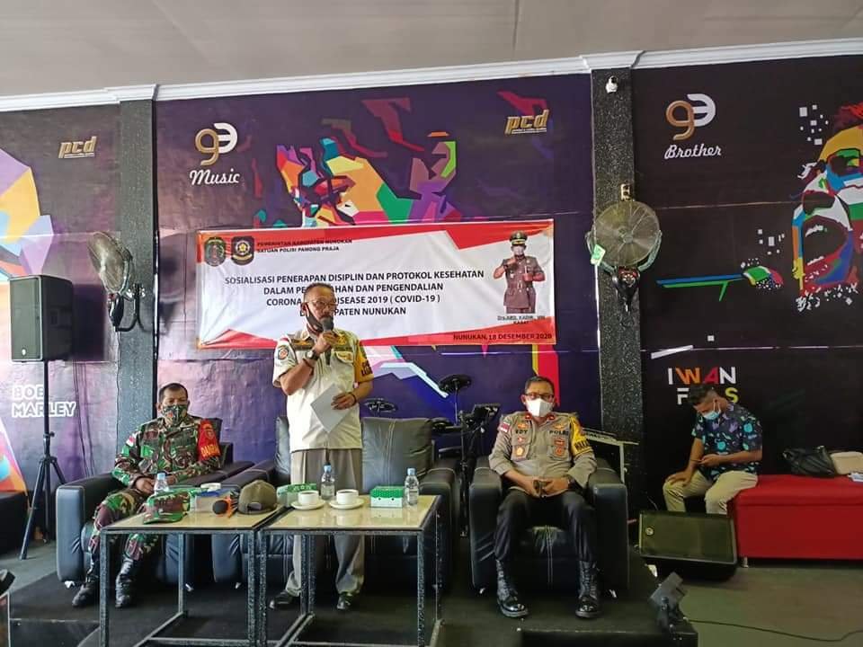 “Hampir semua pelaku usaha yang ada di Kabupaten Nunukan diberikan sosialisasi guna menyampaikan tentang penerapan disiplin dan penegakan hukum protokol kesehatan sebagai upaya dan pengendalian Covid-19. Perbup ini harus terus kita sosialisasikan, jangan bosan untuk terus mengingatkan kepada pengunjung tentang penerapan disiplin protokol kesehatan hingga semua masyarakat atau pengunjung tahu bahaya dan ancaman virus Corona. Ini bukan main-main, karena itu saya minta para pelaku usaha supaya benar-benar menyosialisasikan Perbup ini, dan memberikan kesadaran bagi masyarakat atau pengunjung kiranya selalu menggunakan masker, sering mencuci tangan pakai sabun atau hand sanitizer, menjaga jarak, dan menghindari kerumunan,” imbuhnya.