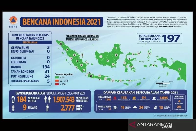 Jakarta – Badan Nasional Penanggulangan Bencana (BNPB) mencatat sebanyak 197 bencana terjadi di seluruh wilayah Indonesia sejak tanggal 1 hingga 23 Januari 2021.