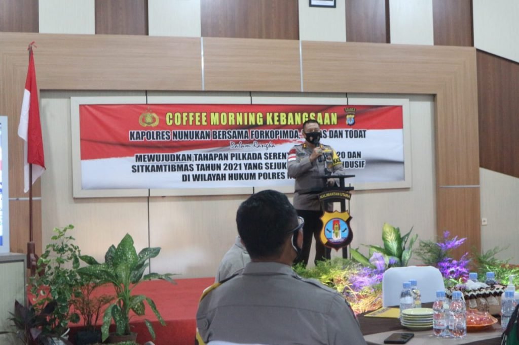 Coffee morning itu mengangkat tema mewujudkan tahapan pilkada serentak tahun 2020 dan Sitkamtibmas tahun 2021 yang sejuk, aman dan kondusif di wilayah hukum Polres Nunukan. Juga dihadiri Asisten Pemerintahan Kabupaten Nunukan Muhammad Amin, SH, yang mewakili Bupati Nunukan, serta unsur forkopimda di Kabupaten Nunukan.