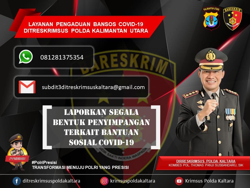 TANJUNG SELOR – Untuk memudahkan masyarakat yang terdampak Covid-19 mengakses informasi dan menyampaikan pengaduan terkait penyaluran bantuan sosial (bansos) dari pemerintah pada masa pandemi Covid-19, Polda Kaltara melalui Ditreskrimsus membuka layanan pengaduan. Layanan pengaduan bansos covid-19 ini bisa langsung disampaikan ke nomor 081281375354.