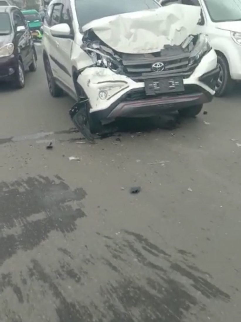 Pasalnya, mobil ini terparkir di tengah jalan dengan kondisi depan mobil rusak berat usai mengalami tabrakan di jalan tersebut.