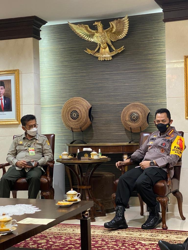 JAKARTA – Kapolri Jenderal Listyo Sigit Prabowo menerima audiensi Menteri Pertanian Syahrul Yasin Limpo bersama jajaran di Ruang Rapat Kapolri, Mabes Polri, Jakarta, Senin (17/5/2021).