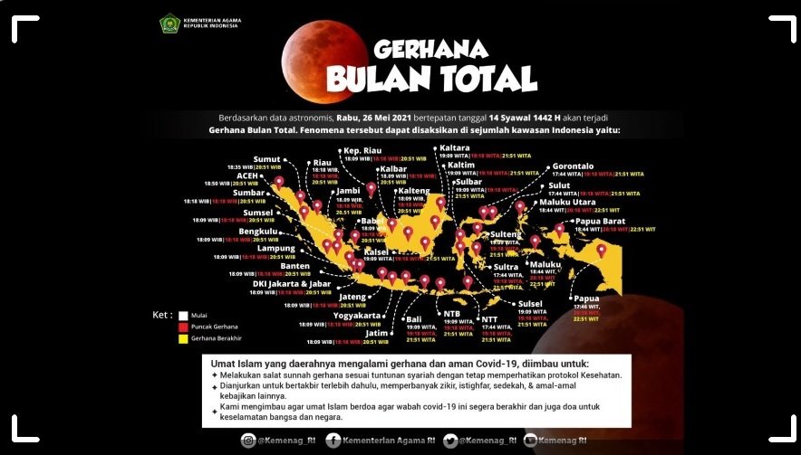 “Mempertimbangkan waktu terbit bulan di masing-masing daerah, maka shalat gerhana bisa dilakukan pada rentang setelah shalat Maghrib sampai selesai gerhana sesuai dengan waktu di atas,” ujar Kamaruddin.