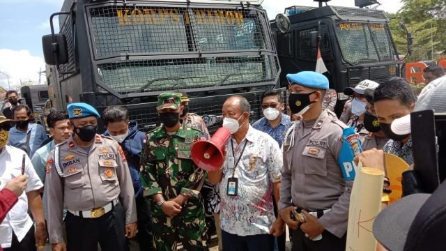 Aksi tersebut dijaga ketat oleh aparat TNI dan POLRI. Pasalnya, kelompok massa aksi sempat ancam blokade bandara apabila Kepala Bandara tidak hadir di lokasi tempat mereka menyampaikan tuntutannya.