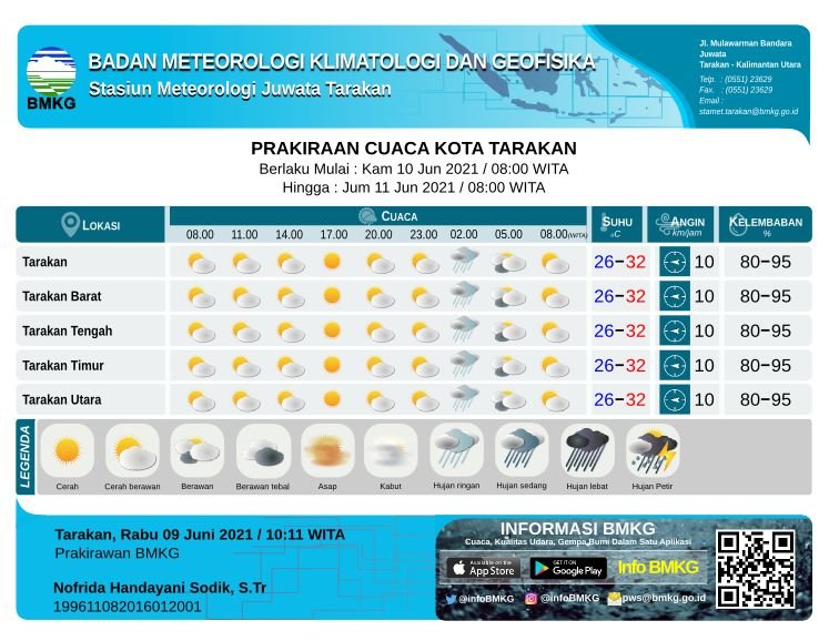 “Mulai Kamis (10/6/2021) dari pagi hingga malam, cuaca Kota Tarakan akan cerah berawan, lalu dilanjut pada dini hari berpotensi hujan ringan,” ujarnya kepada benuanta.co.id.