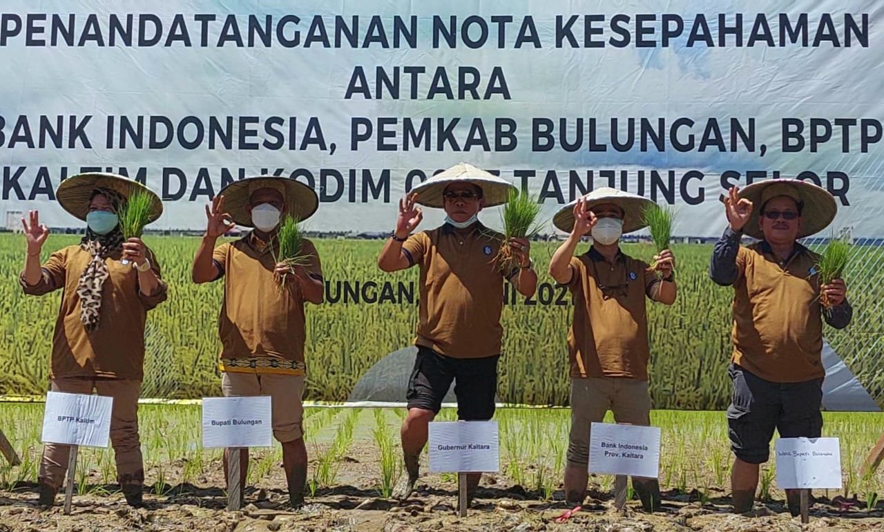 Selain melakukan penanaman padi metode hazton perdana di Desa Sajau Hilir, BI Kaltara bersama Bupati Bulungan dan Kodim 0903 Tanjung Selor melakukan penandatanganan Memorandum of Understanding (MoU), terkait kerja sama tanam padi metode hazton yang disaksikan Gubernur Kaltara.