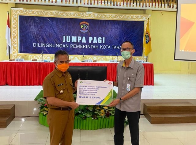 TARAKAN – Penyerahan APD secara simbolis oleh kepala kantor BPJS Ketenagakerjaan Cabang Tarakan Deni Syamsu Rakhmanto kepada Walikota Tarakan dr. Khairul, M.Kes saat acara Jumpa Pagi dilingkungan pemerintah Kota Tarakan di Gedung Serbaguna Pemkot Tarakan pada Selasa (6/7).