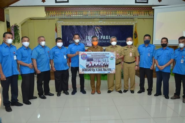 Secara simbolis Direktur Utama Perumda PDAM Tirta Alam Tarakan Iwan Setiawan menyerahkan kepada Wali Kota Tarakan dr. Khairul, M.Kes pada kesempatan Jumpa Pagi Selasa (6/7).