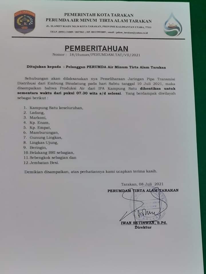 Hal tersebut dikabarkan oleh manejemen PDAM Tirta Alam Kota Tarakan melalui pemberitahuan Nomor: 18/Humas/PERUMDAM TAT/VII/2021 yang ditujukan kepada pelanggan di area tertentu.