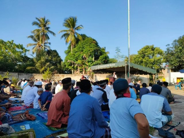 Warga Nunukan selatan, RT 1, kecamatan Nunukan Selatan, menggelar sholat berjamaah di lapangan terbuka tempatnya di halaman pesantren LKSA Al Kautsar.