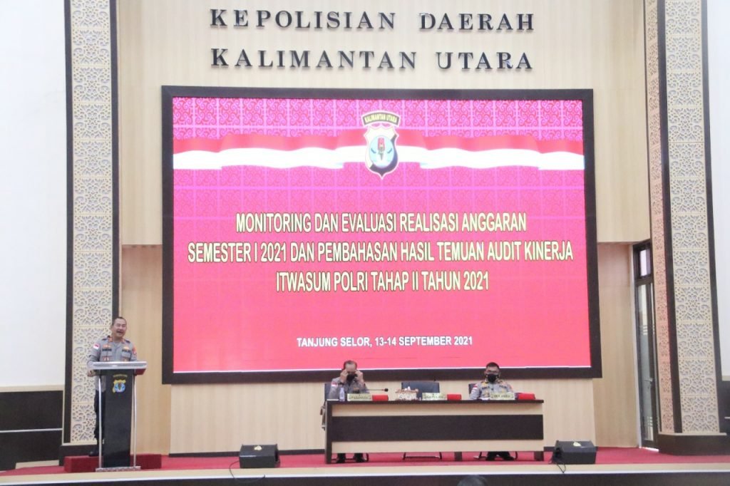 TANJUNG SELOR – Bertempat di Command Center Polda Kaltara telah dilaksanakan kegiatan Rapat Monitoring dan Evaluasi (Monev) Realisasi Anggaran Semester 1 tahun 2021 dan pembahasan Hasil Temuan Audit Kinerja Itwasum Polri Tahap II, Senin (13/09/2021).