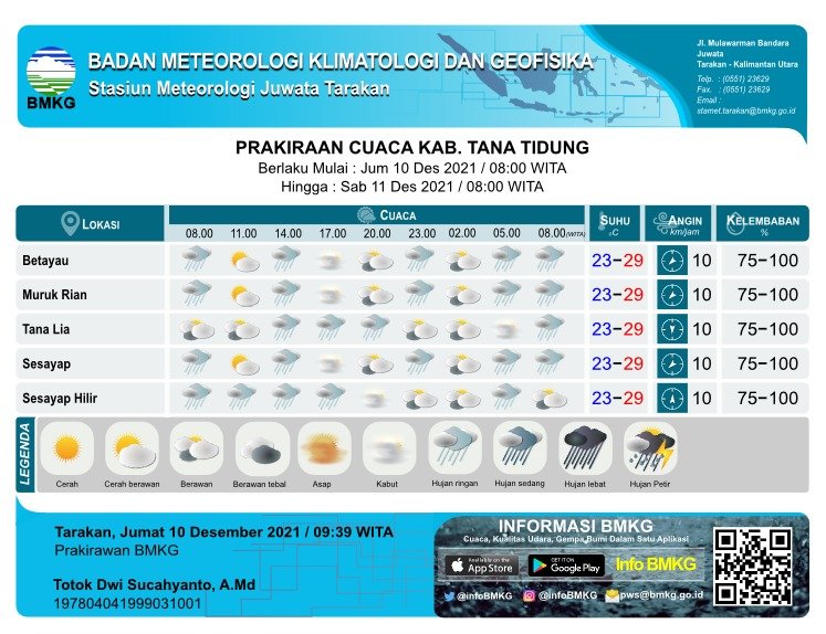 “Dari pengamatan kita wilayah seperti Betayau, Muruk Rian, Tana Lia, Sesayap dan Sesayap Hilir, berpotensi mengalami hujan berintensitas ringan dan sedang hingga petir,” kata Dwi.