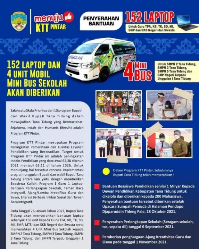Sesuai agenda, penyerahan bantuan laptop dan mini bus akan diserahkan langsung Bupati Tana Tidung Ibrahim Ali pada 26 Januari 2022 mendatang.(*)