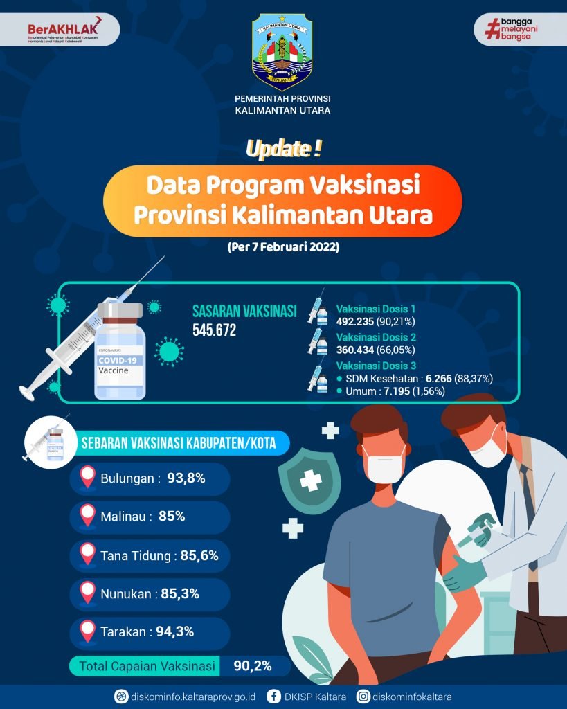 JAKARTA – Data Dashboard Satu Data Vaksinasi Komite Penanganan Covid-19 dan Pemulihan Ekonomi Nasional (KPCPEN) merilis cakupan vaksinasi dosis 1 di provinsi Kalimantan Utara (Kaltara) sudah terealisasi 90,21 persen. Tidak hanya itu dari rilis terbaru (31 Januari – 06 Februari 2022) masyarakat Kaltara yang mengikuti program vaksinasi sebanyak 1.630 orang per minggu.