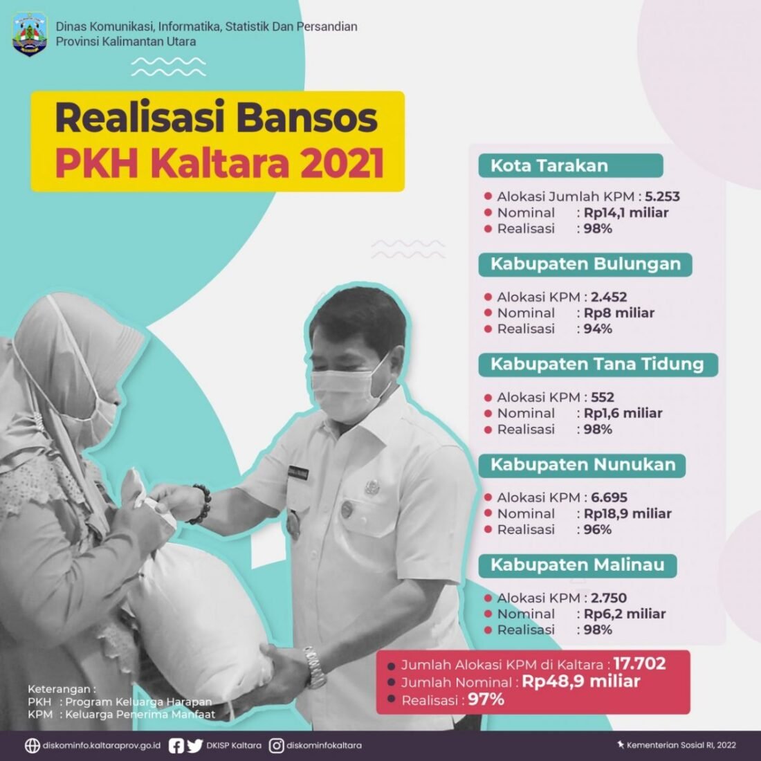 “Sebanyak 17.702 KPM PKH telah menerima bantuan ini melalui 4 tahap. Alhamdulillah dari data yang disampaikan oleh Koordinator Wilayah (Korwil) PKH Kaltara, Fadly Lutfi, sepanjang tahun 2021 telah terealisasi. Saya berharap program ini dapat kembali berlanjut pada tahun 2022,”jelas Gubernur. Seperti diketahui, tahun 2021 pemerintah melalui Kementerian Sosial RI mengucurkan anggaran PKH sebesar Rp 48,9 miliar untuk Kaltara secara bertahap dari anggaran pendapatan dan belanja negara (APBN).