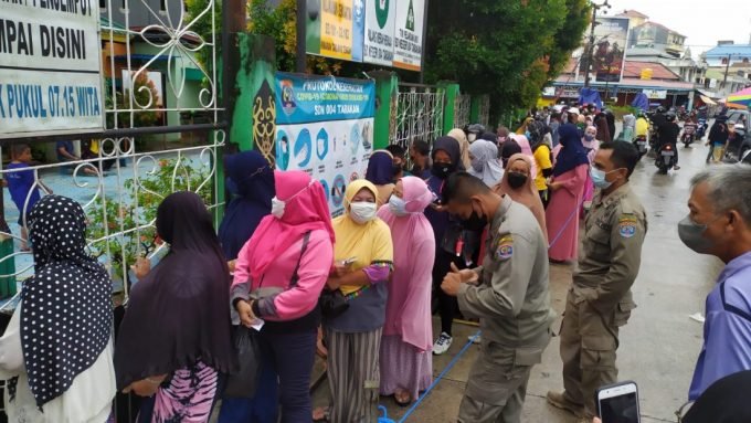 benuanta.co.id, TARAKAN – Dinas Koperasi UMKM dan Perdagangan (DKUMP) Tarakan menggelar operasi pasar minyak goreng di depan SDN 004 Kota Tarakan, Ahad, 13 Maret 2022. Puluhan warga antrean memanjang ke belakang untuk mendapatkan minyak goreng dan masing-masing yang antre memegang kupon.