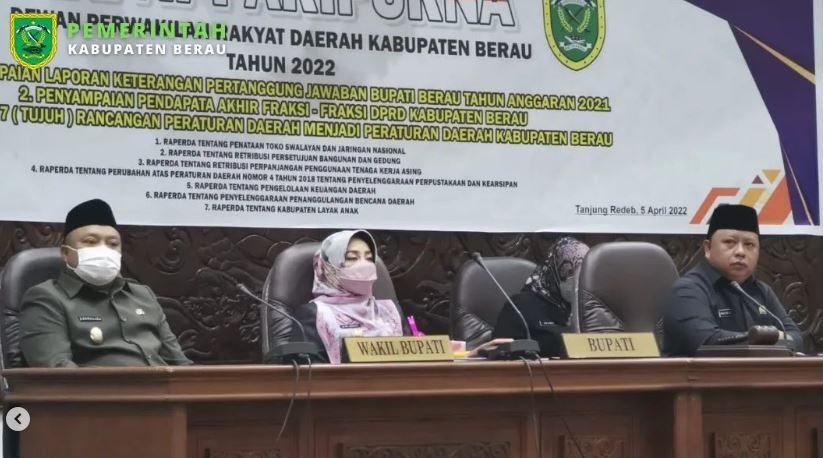 BERAU – Bupati Berau, Hj. Sri Juniarsih Mas dan Wakil Bupati (Wabup), H. Gamalis menghadiri rapat Paripurna dalam rangka penyampaian Laporan Keterangan Pertanggungjawaban (LKPJ) Bupati Berau TA 2021 dan Penyampaian Pendapat Akhir Fraksi terhadap 7 Raperda Kabupaten Berau menjadi Perda Kabupaten Berau, di ruang rapat lantai II Kantor DPRD Berau, pada Selasa (5/4/2022).