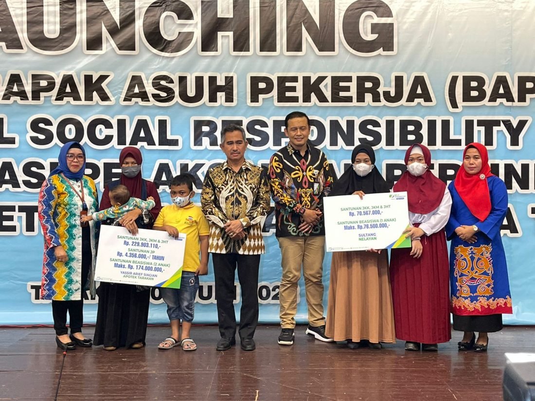 TARAKAN – Wali Kota Tarakan dr. Khairul, M.Kes didampingi Direktur Keuangan BPJAMSOSTEK Asep Rahmat Suwandha pada Kamis (9/6) malam dalam rangkaian kegiatan launching program “Bapak Asuh Pekerja (BAP)” menyerahkan secara simbolis santunan JKK/JKM dan JHT serta santunan jaminan pensiun (JP) dan santunan beasiswa kepada ahli waris Yassir Arief Siagian dan Sultang yang merupakan nelayan di Kota Tarakan.