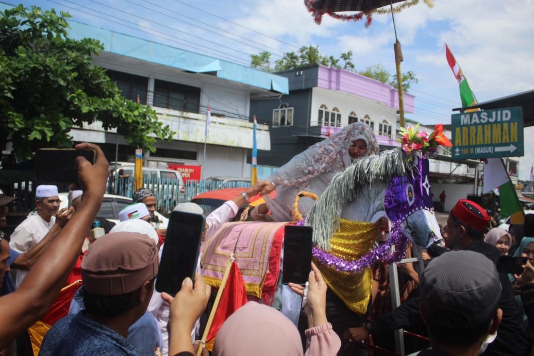 Berdasarkan pantauan benuanta.co.id di lapangan, jemaah haji yang baru pulang di arak keliling dengan menunggangi kuda-kudaan lengkap dengan iringan musik.