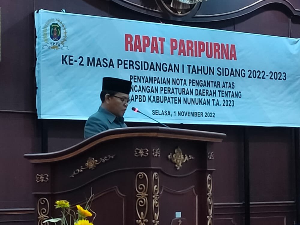 benuanta.co.id, NUNUKAN – Wakil Bupati (Wabup) Nunukan H. Hanafiah menyampaikan Nota Pengantar Rancangan Peraturan Daerah tentang APBD Kabupaten Nunukan tahun anggaran 2023, pada rapat paripurna yang dilaksanakan di Ruang Rapat Lt. 1 Kantor DPRD Kabupaten Nunukan, Selasa (1/11) pagi.