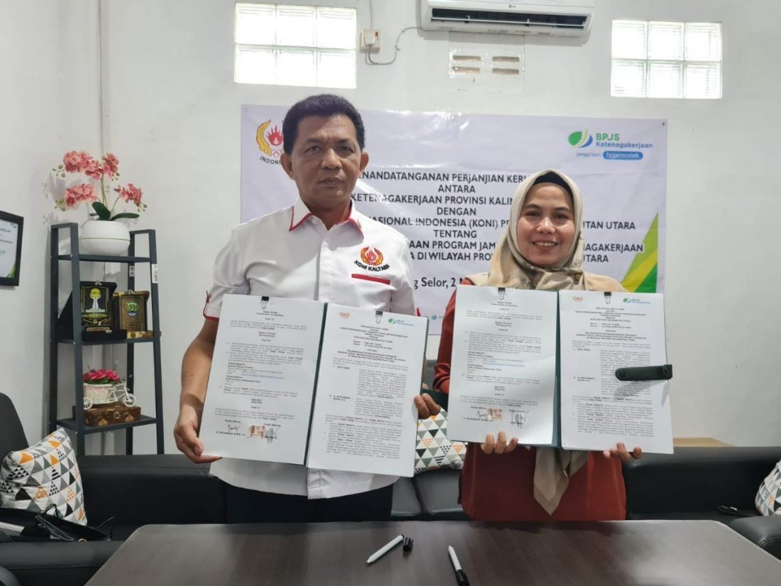 Guna merealisasikan hal tersebut BPJS Ketenagakerjaan (BPJAMSOSTEK) Kantor Cabang Tarakan dan Komite Olahraga Nasional Indonesia (KONI) Kalimantan Utara telah menjalin kerja sama melalui nota kesepahaman yang secara resmi ditandatangani oleh Kepala Kantor Cabang BPJS Ketenagakerjaan (BPJAMSOSTEK) Tarakan Rina Umar dan Ketua Komite Olahraga Nasional Indonesia (KONI) Kalimantan Utara Muhammad Nasir, SE. Rabu (2/11)