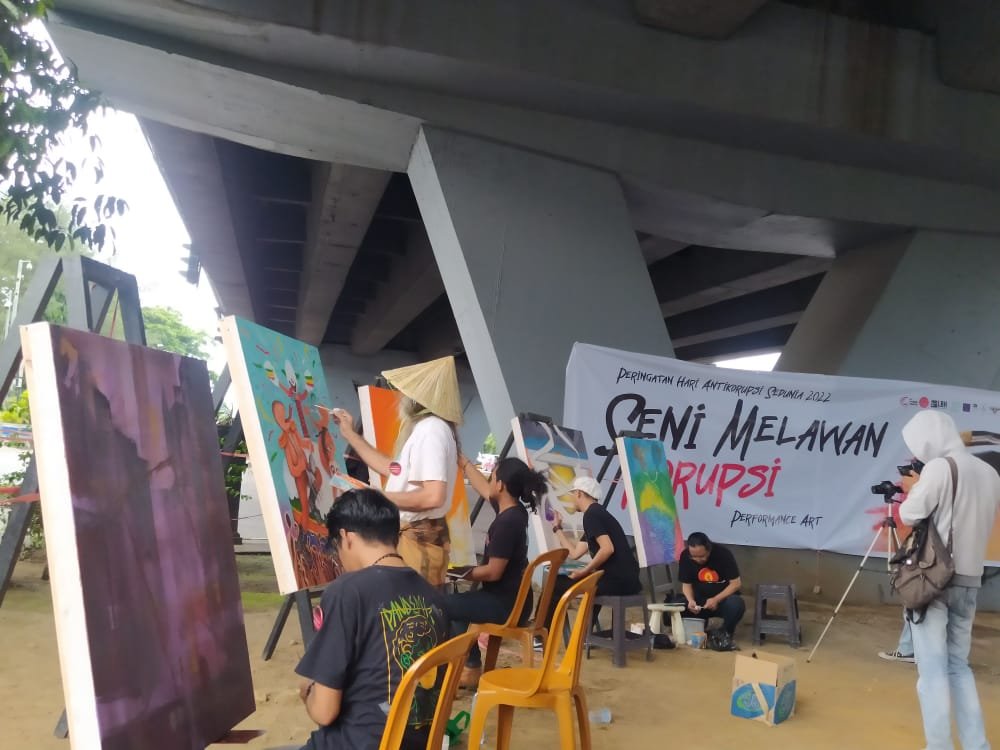 Dalam kegiatan ini MARS dan MAIM menggelar aksi kreatif berupa performance art dengan tema ‘Seni Melawan Korupsi’ yang dilaksanakan di bawah jembatan layang Fly Over di Jalan Urip Sumoharjo, Makassar, Kamis, (8/12/2021).