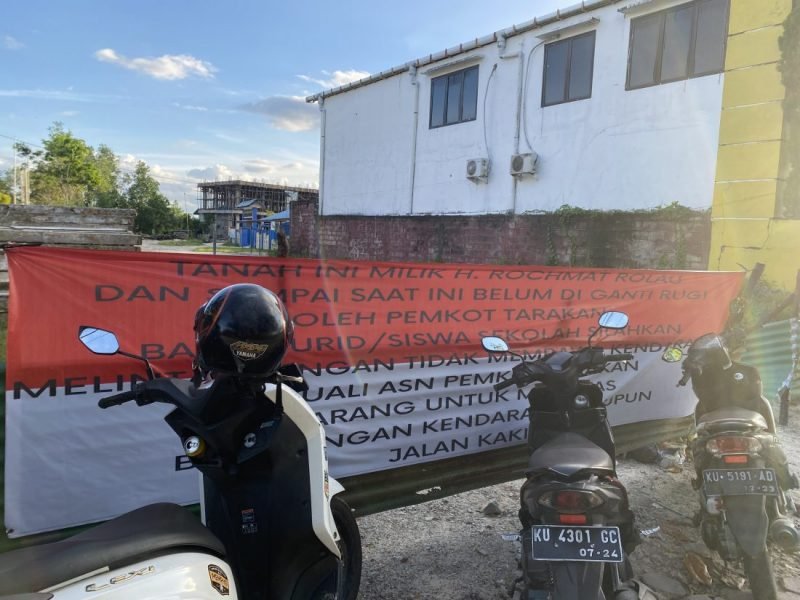 “Tanah ini milik H. Rochmat Rolau dan sampai saat ini belum diganti rugi oleh Pemkot Tarakan, bagi murid/siswa sekolah silahkan melintas dengan tidak membawa kendaraan kecuali ASN Pemkot Tarakan dilarang untuk melintas baik dengan kendaraan maupun jalan kaki”