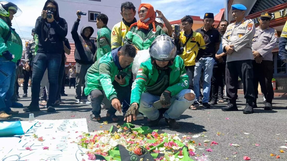 Lebih dari 250 driver ojol hadir dalam aksi tersebut. Dengan penuh khidmat, mereka menaburkan bunga di depan Mako Polres Tarakan.