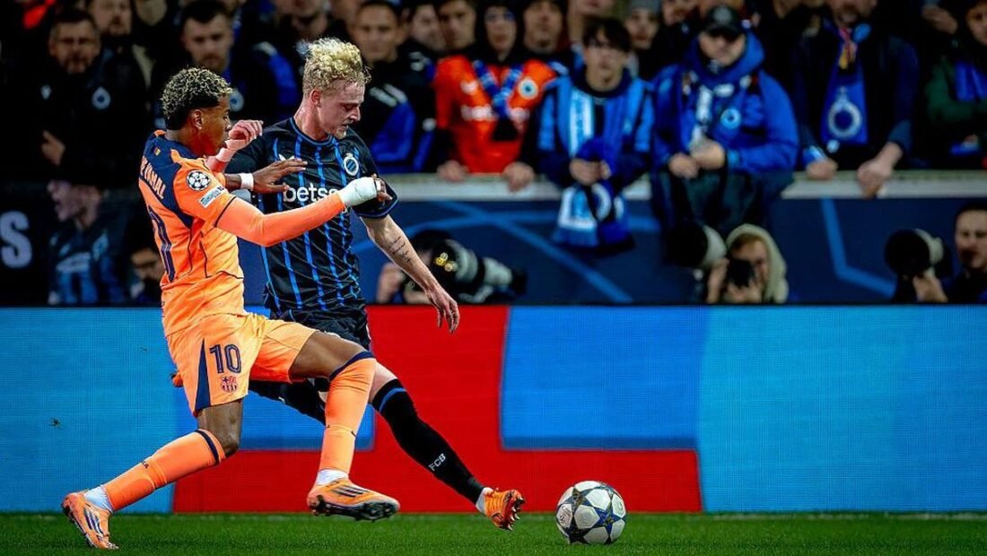 Christos Tzolis nyaris memperbesar keunggulan Brugge pada menit ke-34, tetapi upayanya digagalkan pertahanan Barcelona.