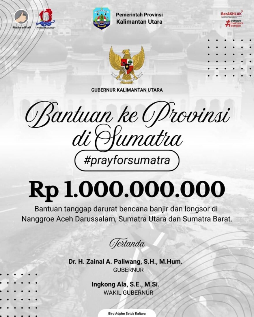 benuanta.co.id, TARAKAN – Pemerintah Provinsi Kalimantan Utara (Kaltara) menyalurkan bantuan senilai Rp1 miliar untuk membantu para korban bencana alam di wilayah Sumatra. Bantuan ini diambil dari Anggaran Pendapatan dan Belanja Daerah (APBD) 2025 sebagai bentuk kepedulian terhadap sesama yang sedang terdampak musibah.